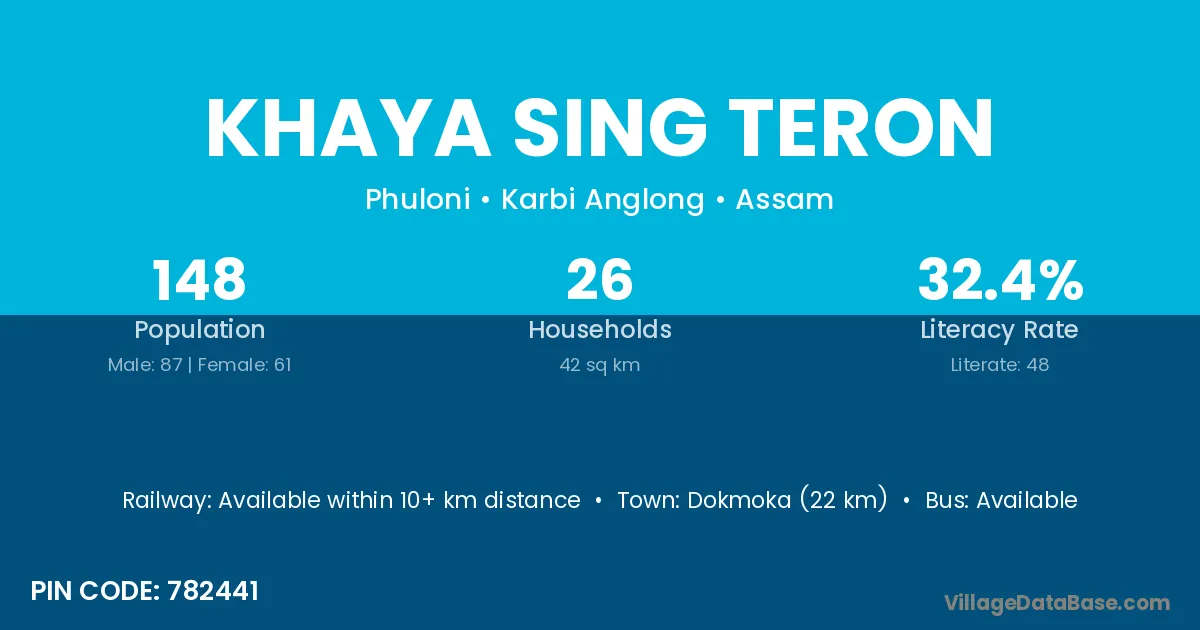 Dokmoka (22 km) is the nearest town to Khaya Sing Teron village for major economic activities and is located approximately 22 km away.