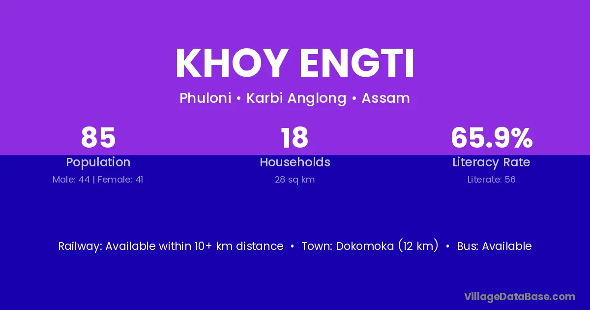 Khoy Engti village has a total population of 85 people, of which 44 are males and 41 are females.