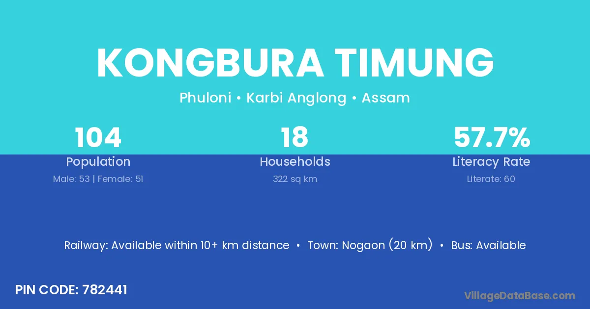 Nogaon (20 km) is the nearest town to Kongbura Timung village for major economic activities and is located approximately 20 km away.