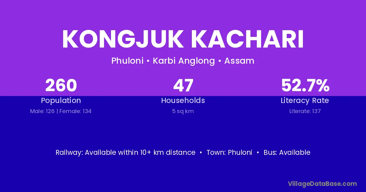 Kongjuk Kachari village has a total population of 260 people, of which 126 are males and 134 are females.