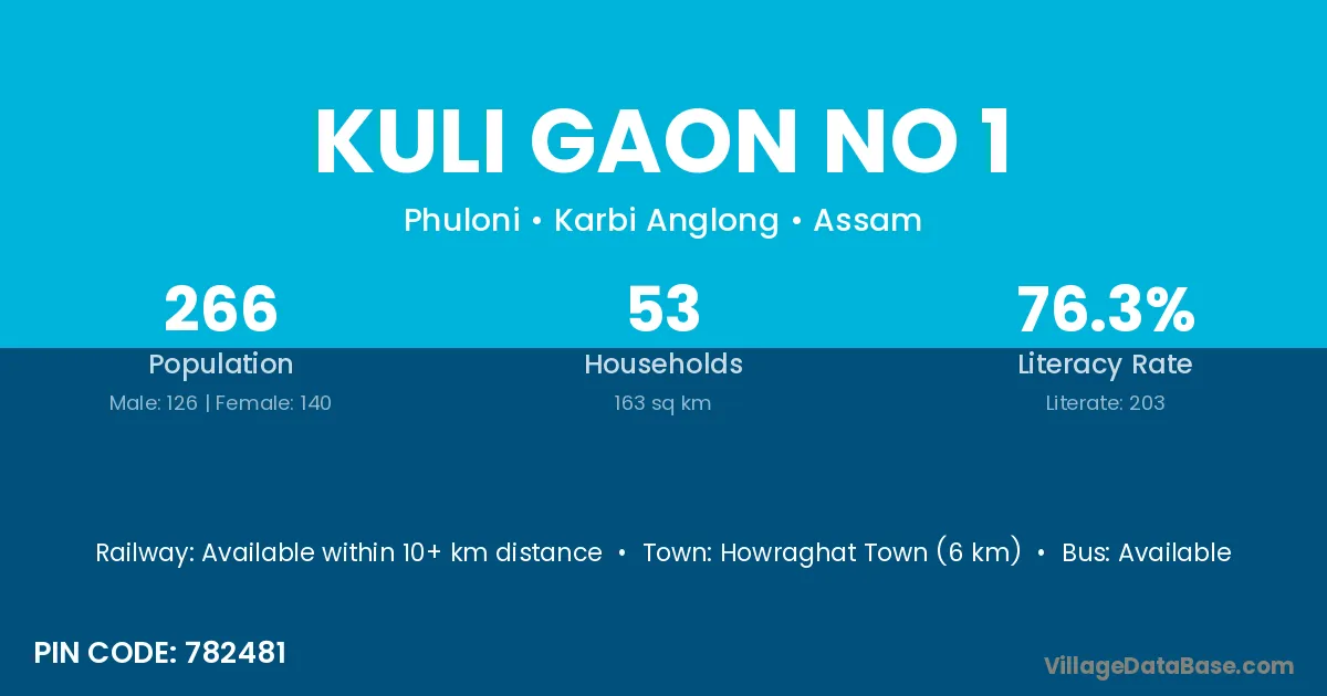 Howraghat Town (6 km) is the nearest town to Kuli Gaon No 1 village for major economic activities and is located approximately 6 km away.