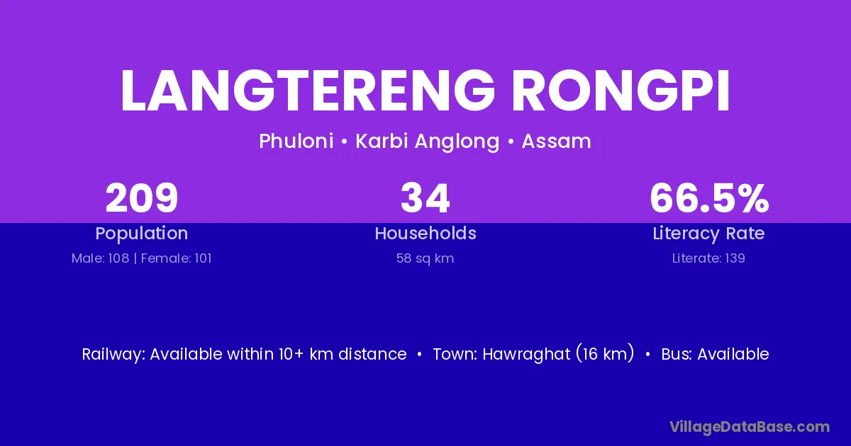 Hawraghat (16 km) is the nearest town to Langtereng Rongpi village for major economic activities and is located approximately 16 km away.