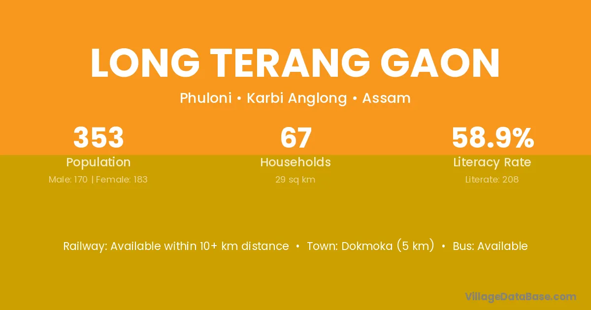 Dokmoka (5 km) is the nearest town to Long Terang Gaon village for major economic activities and is located approximately 5 km away.