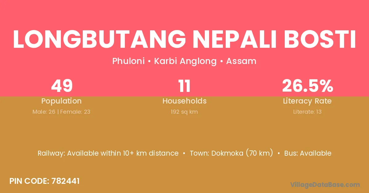 Longbutang Nepali Bosti village has a total population of 49 people, of which 26 are males and 23 are females.