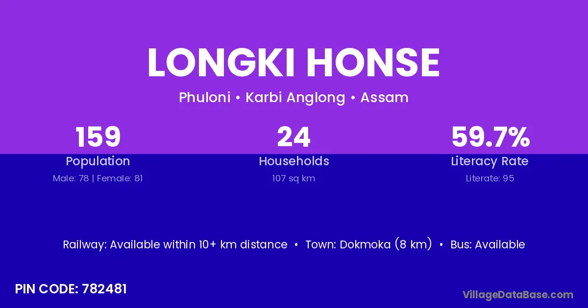 Dokmoka (8 km) is the nearest town to Longki Honse village for major economic activities and is located approximately 8 km away.