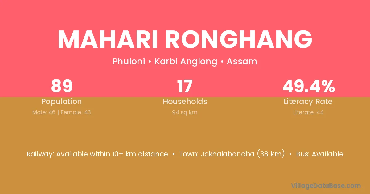 Mahari Ronghang village has a total population of 89 people, of which 46 are males and 43 are females.