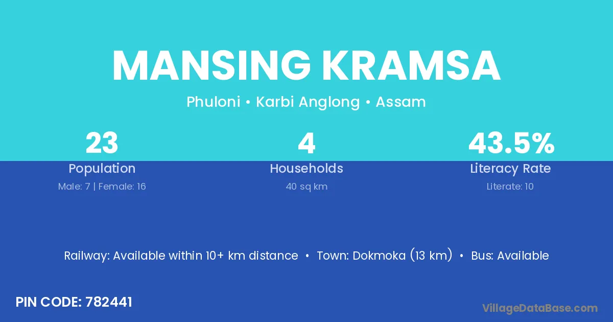 Dokmoka (13 km) is the nearest town to Mansing Kramsa village for major economic activities and is located approximately 13 km away.