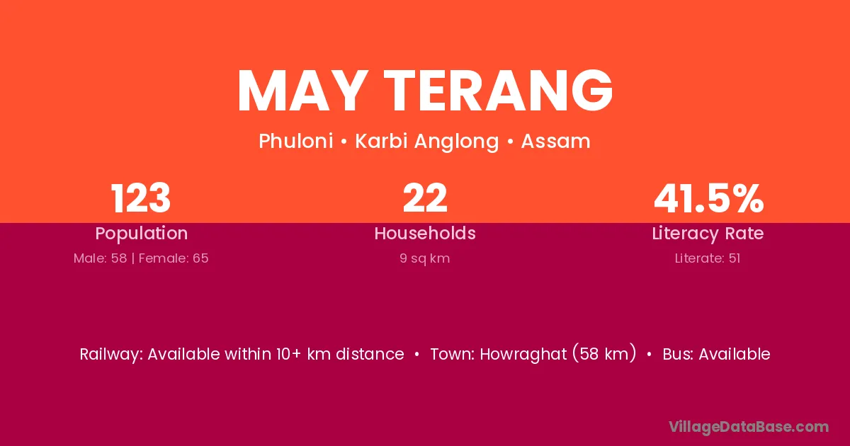 Howraghat (58 km) is the nearest town to May Terang village for major economic activities and is located approximately 58 km away.