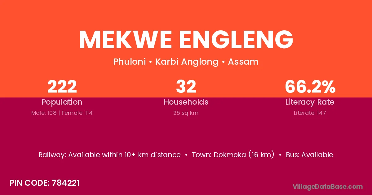Dokmoka (16 km) is the nearest town to Mekwe Engleng village for major economic activities and is located approximately 16 km away.