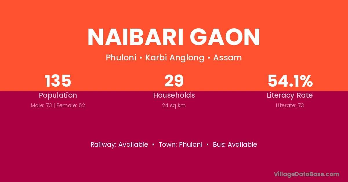 Naibari Gaon village has a total population of 135 people, of which 73 are males and 62 are females.