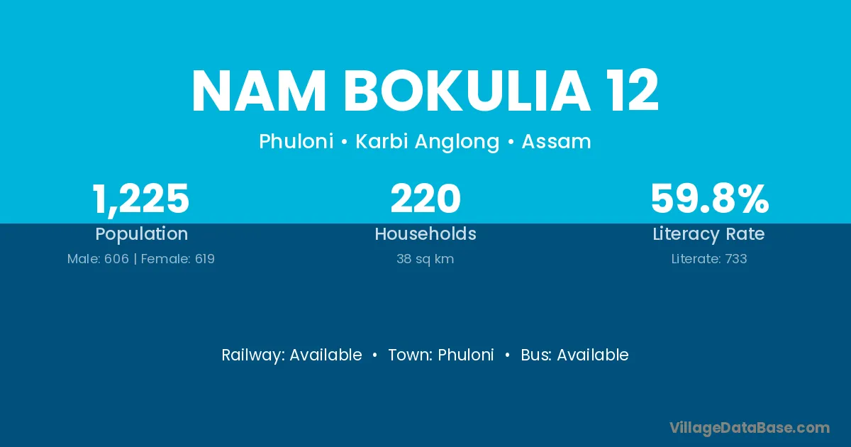 Nam Bokulia 12 village has a total population of 1,225 people, of which 606 are males and 619 are females.