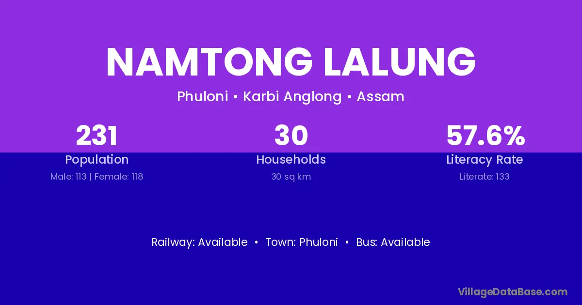 Namtong Lalung village has a total population of 231 people, of which 113 are males and 118 are females.