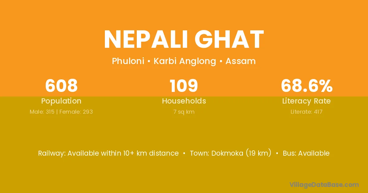 Dokmoka (19 km) is the nearest town to Nepali Ghat village for major economic activities and is located approximately 19 km away.