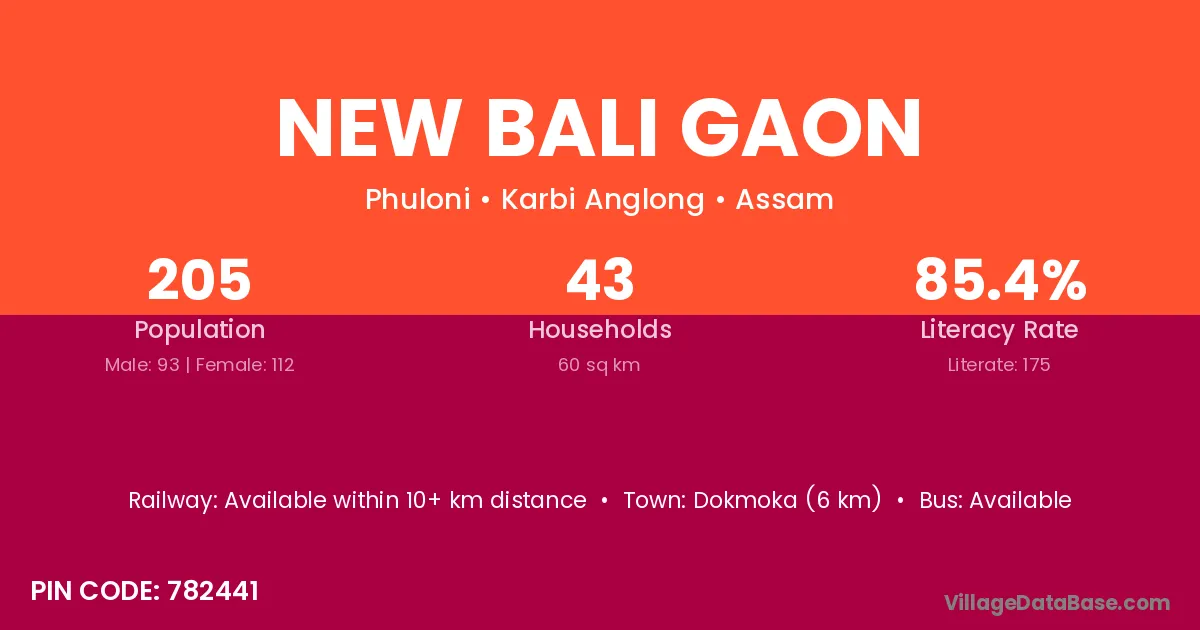 Dokmoka (6 km) is the nearest town to New Bali Gaon village for major economic activities and is located approximately 6 km away.