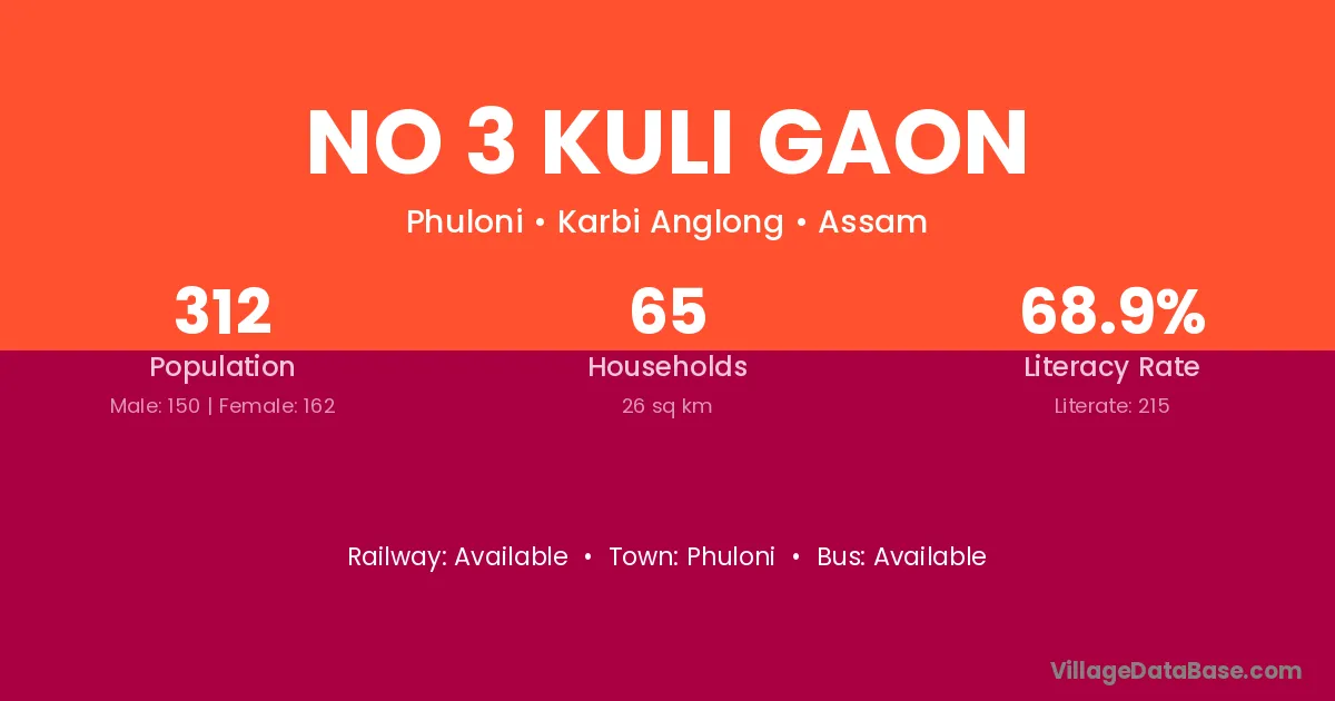 No 3 Kuli Gaon village has a total population of 312 people, of which 150 are males and 162 are females.