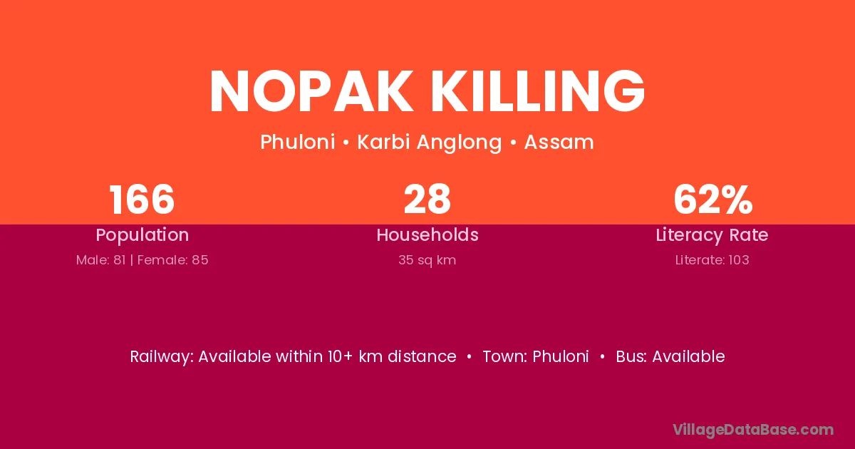 Nopak Killing village has a total population of 166 people, of which 81 are males and 85 are females.