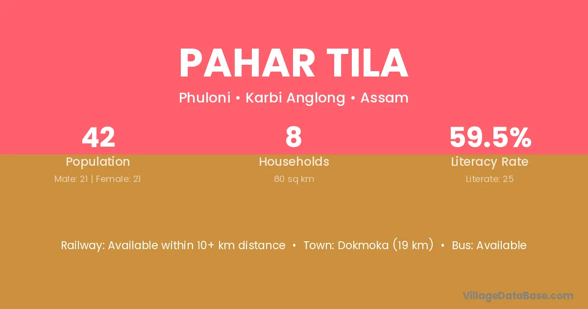 Dokmoka (19 km) is the nearest town to Pahar Tila village for major economic activities and is located approximately 19 km away.
