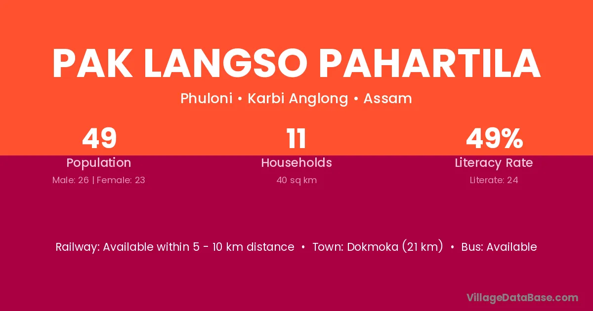 Dokmoka (21 km) is the nearest town to Pak Langso Pahartila village for major economic activities and is located approximately 21 km away.