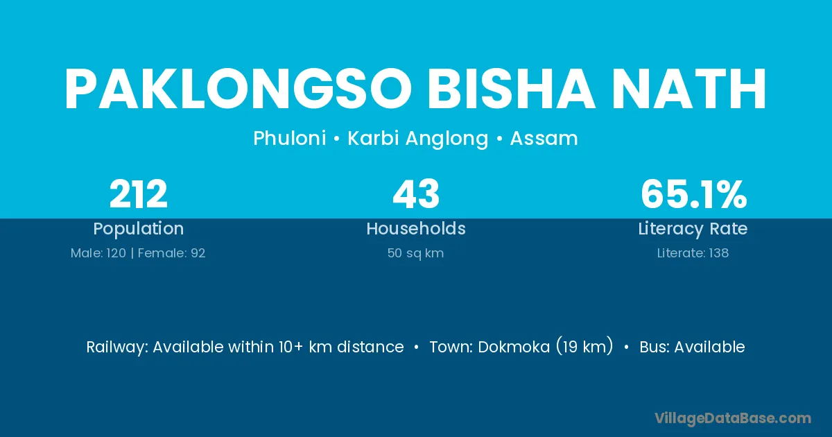 Dokmoka (19 km) is the nearest town to Paklongso Bisha Nath village for major economic activities and is located approximately 19 km away.