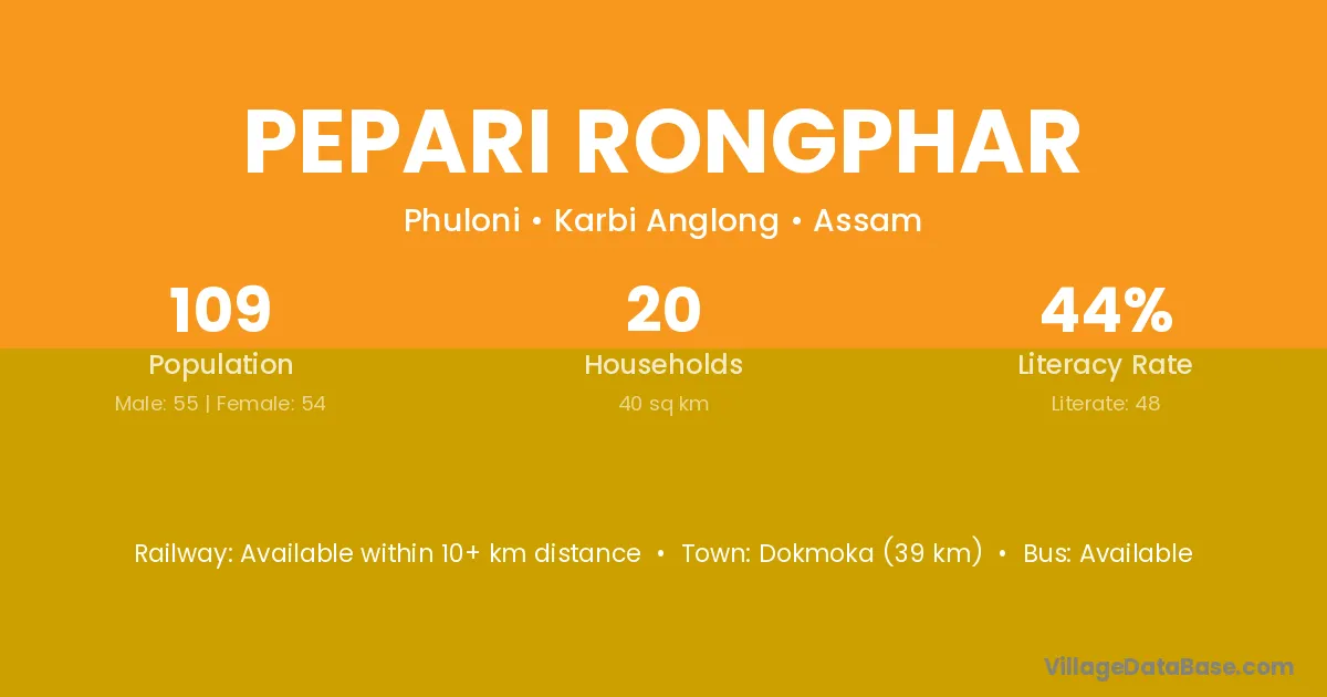 Dokmoka (39 km) is the nearest town to Pepari Rongphar village for major economic activities and is located approximately 39 km away.