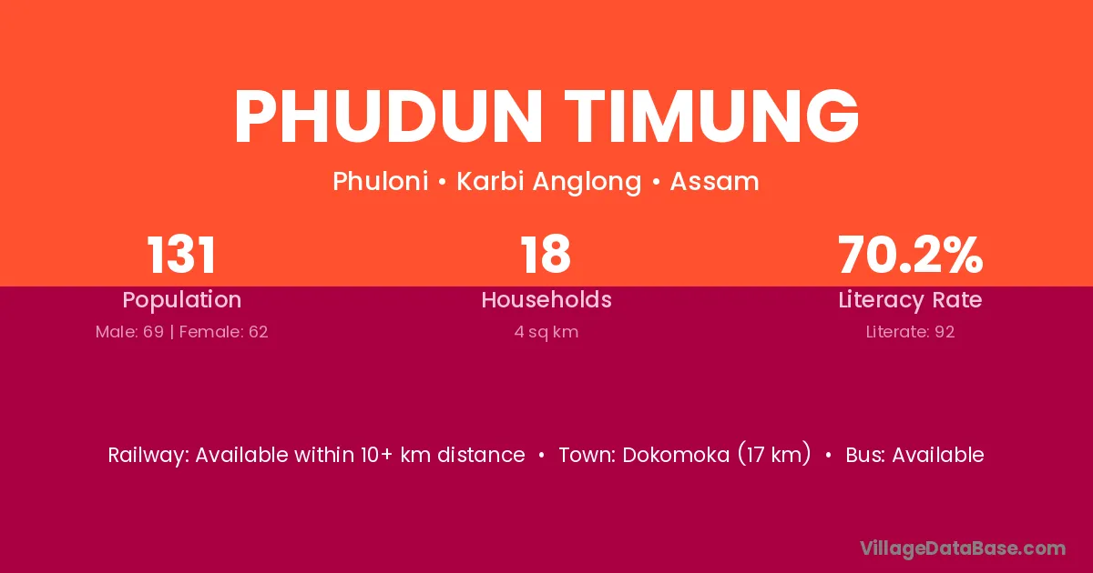 Dokomoka (17 km) is the nearest town to Phudun Timung village for major economic activities and is located approximately 17 km away.