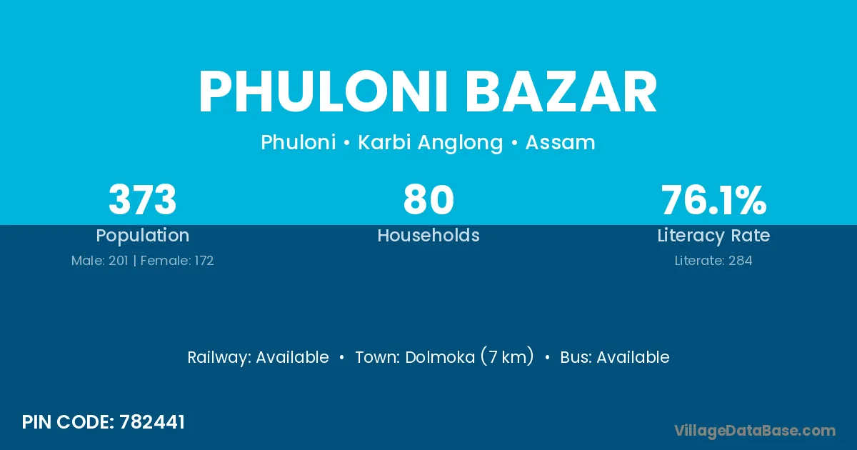 Phuloni Bazar village has a total population of 373 people, of which 201 are males and 172 are females.