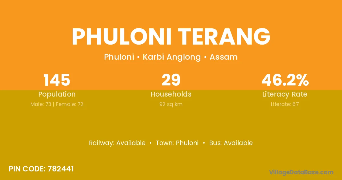 Phuloni Terang village has a total population of 145 people, of which 73 are males and 72 are females.
