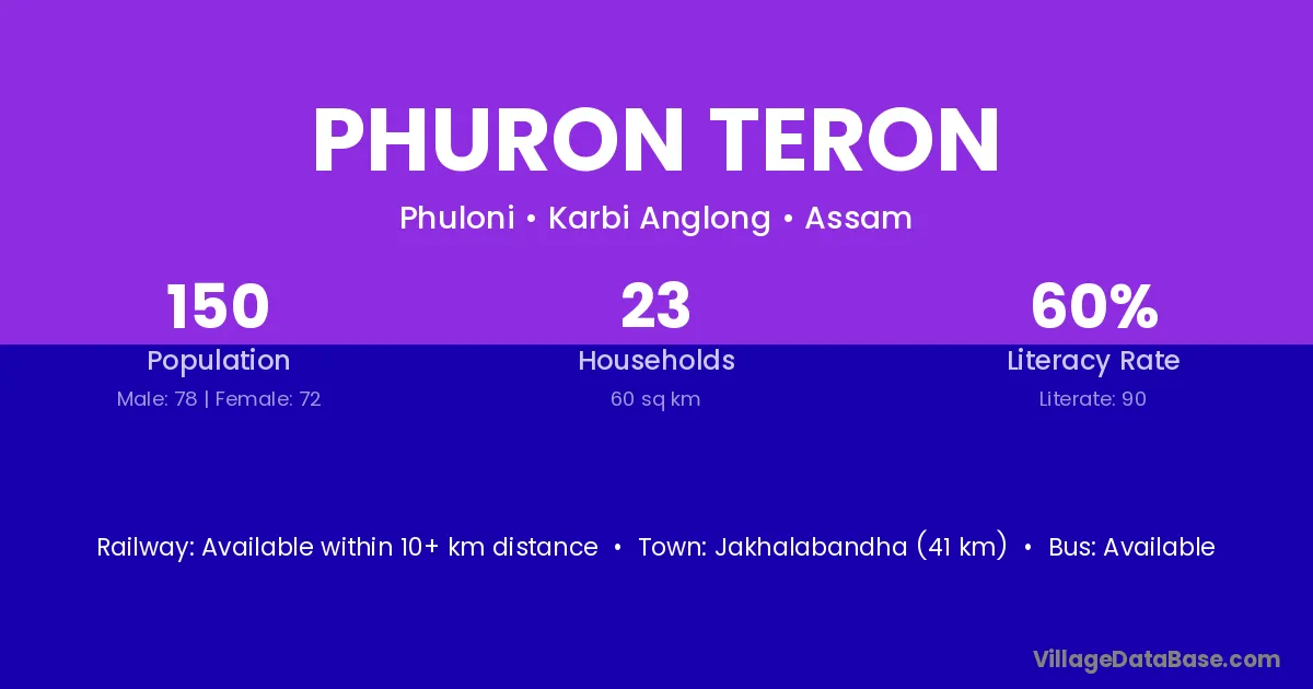 Jakhalabandha (41 km) is the nearest town to Phuron Teron village for major economic activities and is located approximately 41 km away.