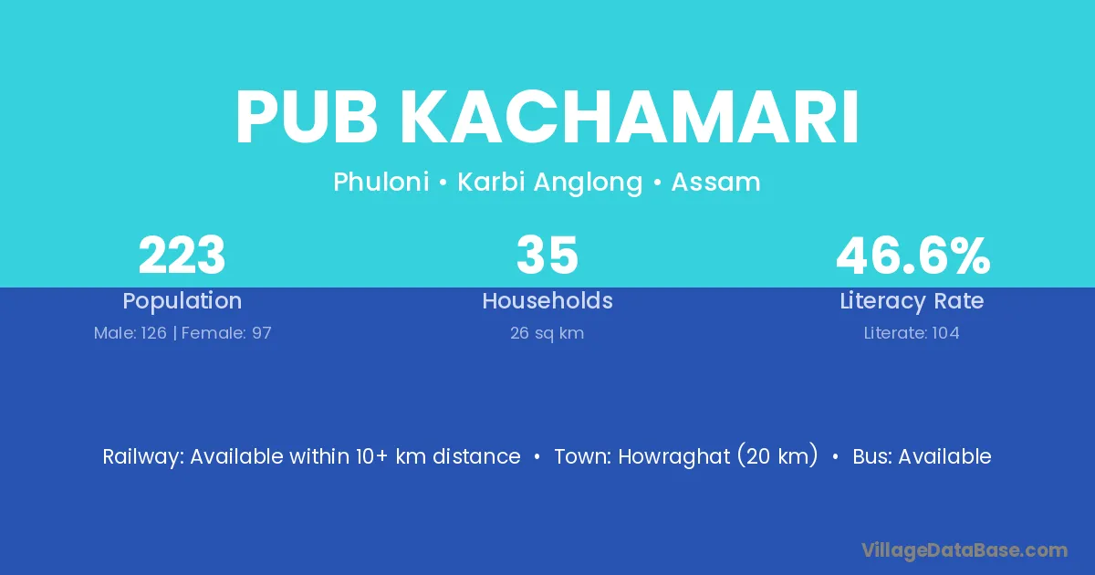 Howraghat (20 km) is the nearest town to Pub Kachamari village for major economic activities and is located approximately 20 km away.