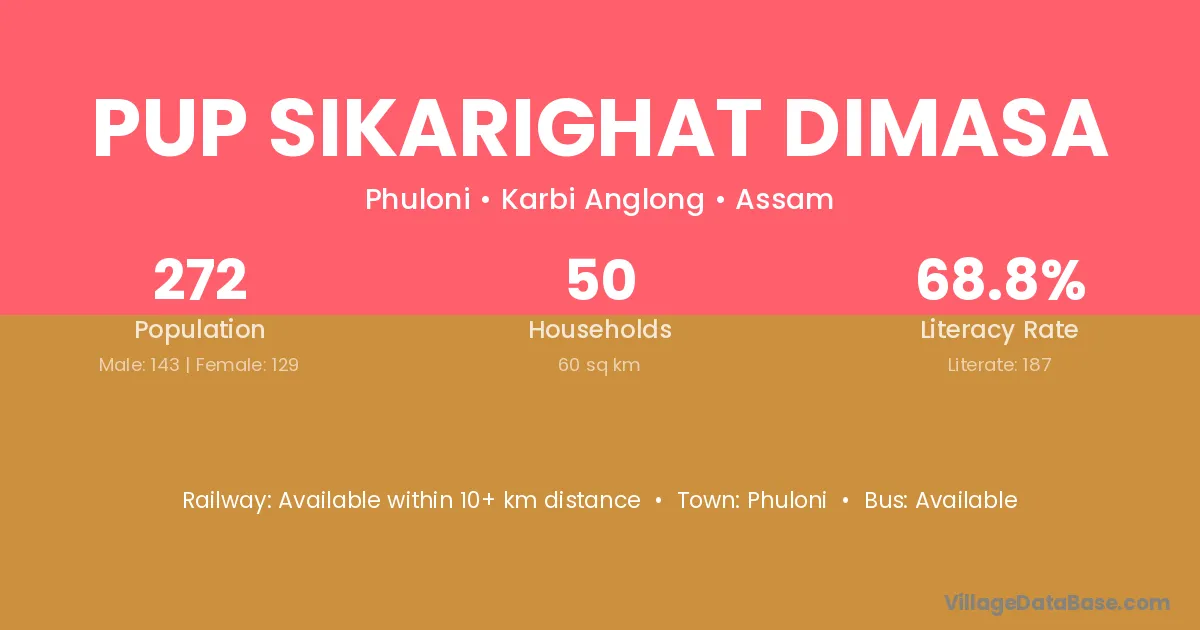 Pup Sikarighat Dimasa village has a total population of 272 people, of which 143 are males and 129 are females.