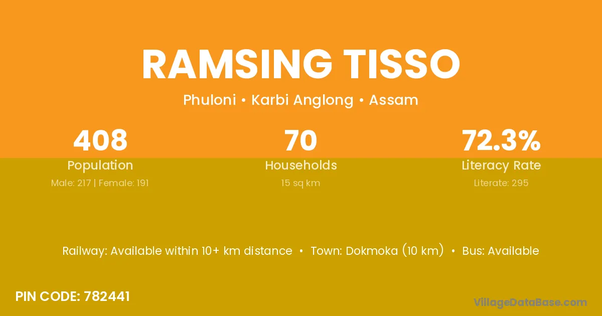 Dokmoka (10 km) is the nearest town to Ramsing Tisso village for major economic activities and is located approximately 10 km away.