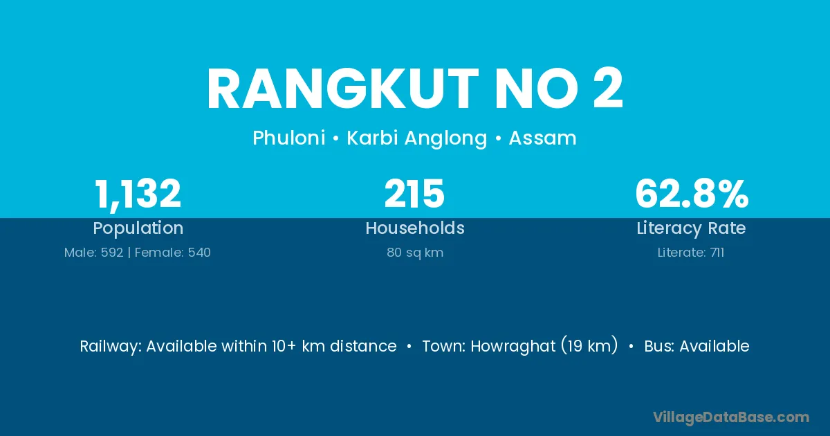 Howraghat (19 km) is the nearest town to Rangkut No 2 village for major economic activities and is located approximately 19 km away.