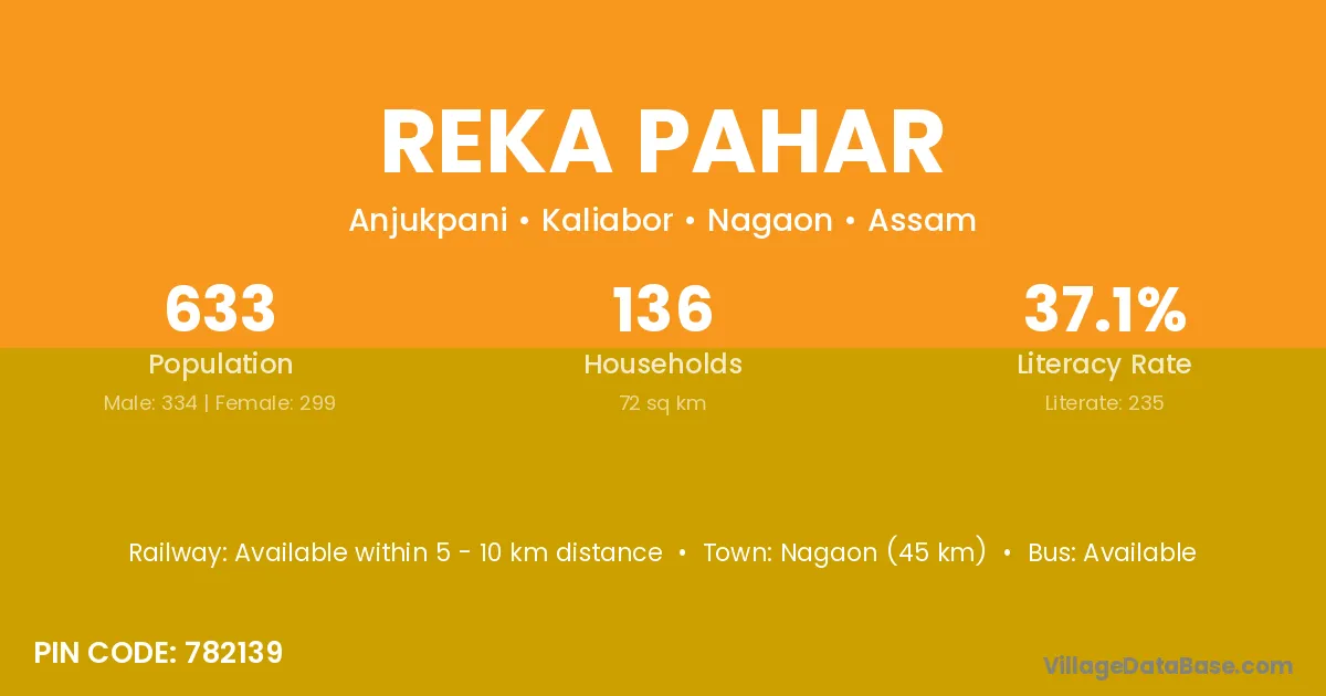 Nagaon (47 km) is the nearest town to Reka Pahar village for major economic activities and is located approximately 47 km away.