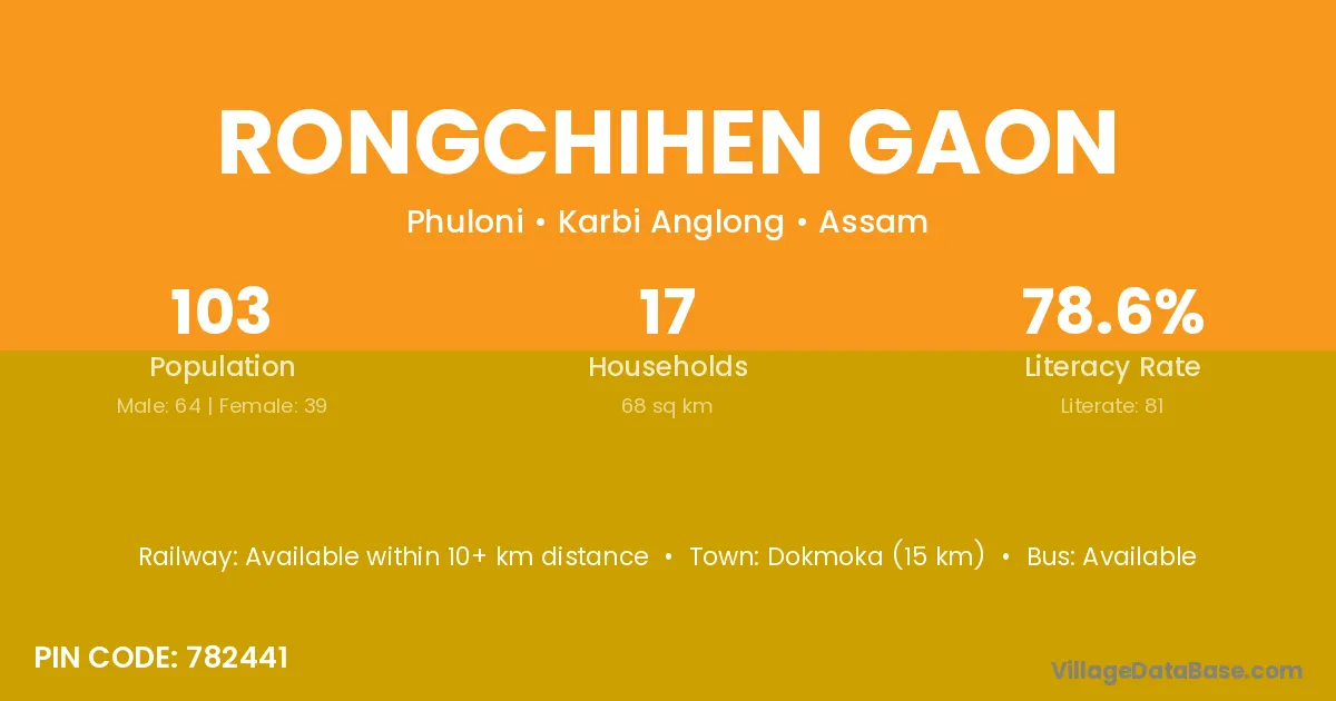 Dokmoka (15 km) is the nearest town to Rongchihen Gaon village for major economic activities and is located approximately 15 km away.