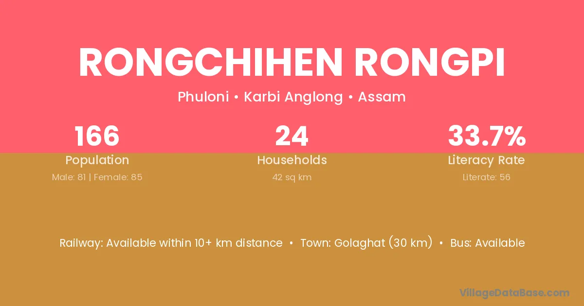 Golaghat (30 km) is the nearest town to Rongchihen Rongpi village for major economic activities and is located approximately 30 km away.