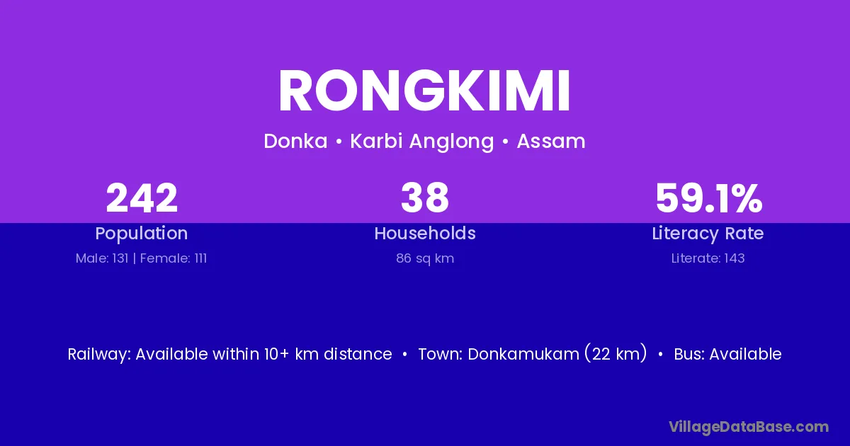 The literacy rate of Rongkimi village is 75.67%. Male literacy stands at 79.26% and female literacy at 72.32%.