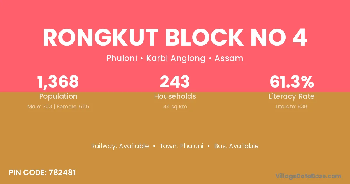 Rongkut Block No 4 village has a total population of 1,368 people, of which 703 are males and 665 are females.