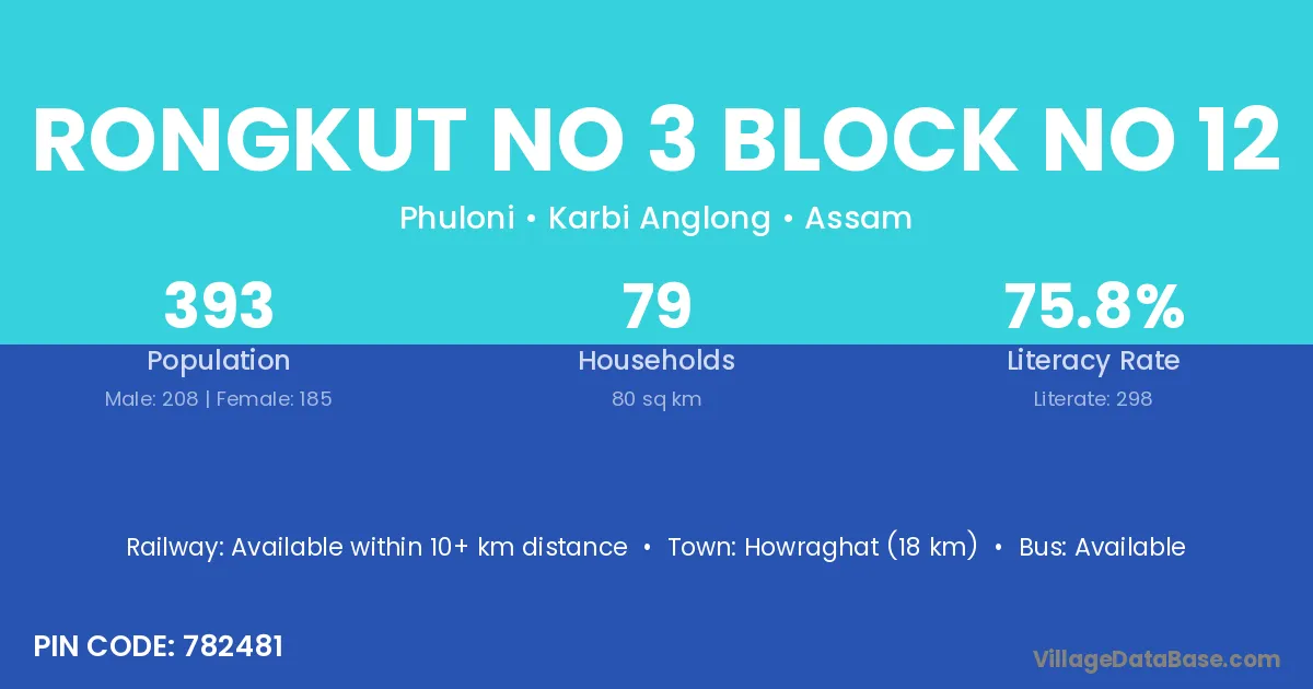 Howraghat (18 km) is the nearest town to Rongkut No 3 Block No 12 village for major economic activities and is located approximately 18 km away.