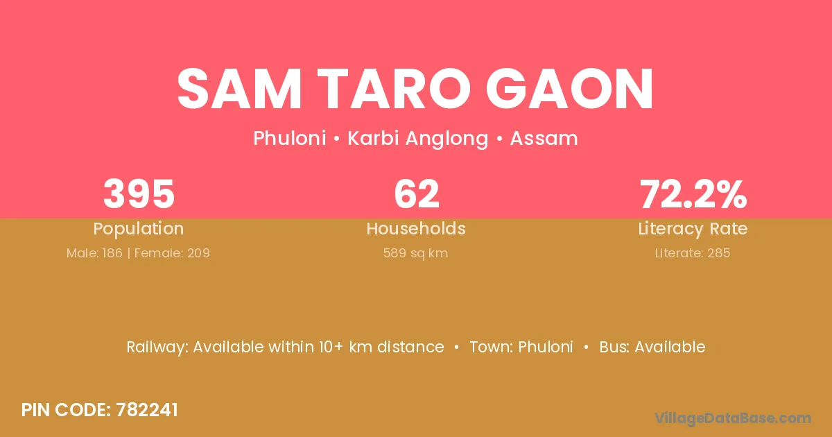 Sam Taro Gaon village has a total population of 395 people, of which 186 are males and 209 are females.