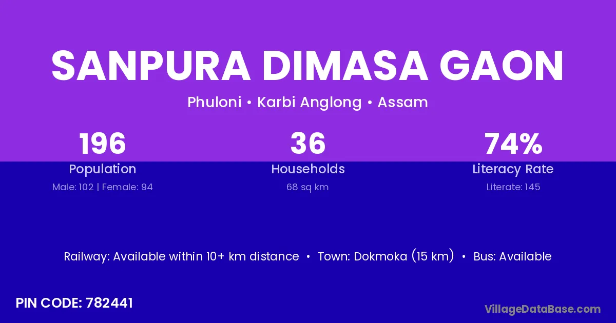 Sanpura Dimasa Gaon village has a total population of 196 people, of which 102 are males and 94 are females.