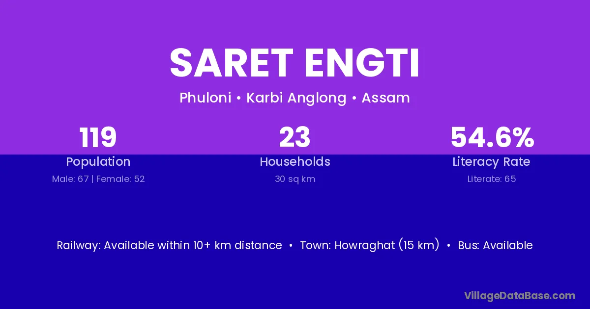 Saret Engti village has a total population of 119 people, of which 67 are males and 52 are females.