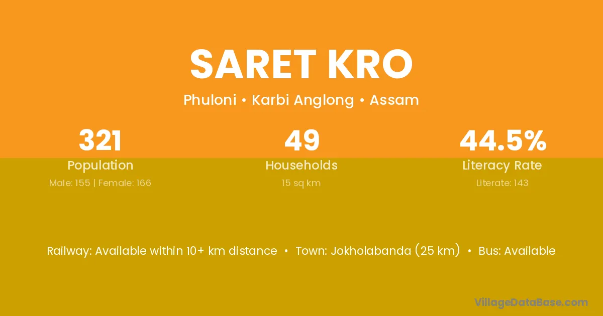 Jokholabanda (25 km) is the nearest town to Saret Kro village for major economic activities and is located approximately 25 km away.