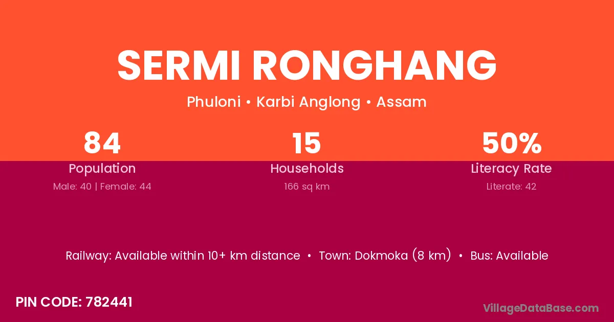 Dokmoka (8 km) is the nearest town to Sermi Ronghang village for major economic activities and is located approximately 8 km away.