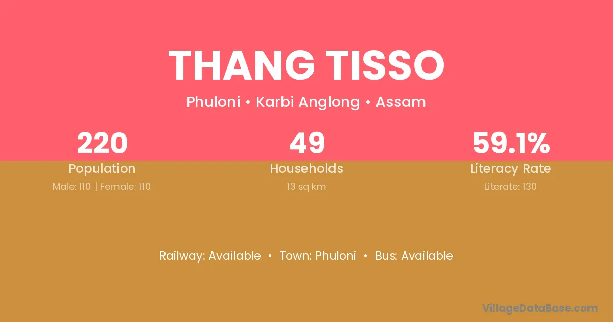 Thang Tisso village has a total population of 220 people, of which 110 are males and 110 are females.