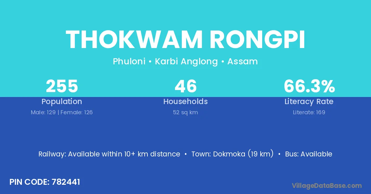 Dokmoka (19 km) is the nearest town to Thokwam Rongpi village for major economic activities and is located approximately 19 km away.