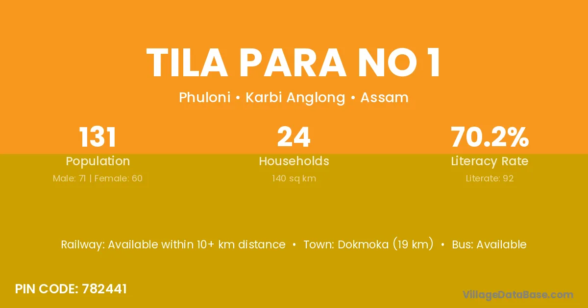 Dokmoka (19 km) is the nearest town to Tila Para No 1 village for major economic activities and is located approximately 19 km away.