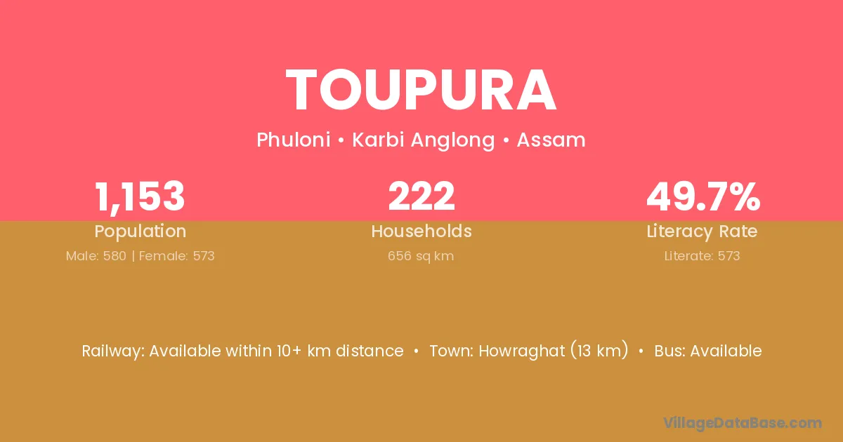 Howraghat (13 km) is the nearest town to Toupura village for major economic activities and is located approximately 13 km away.
