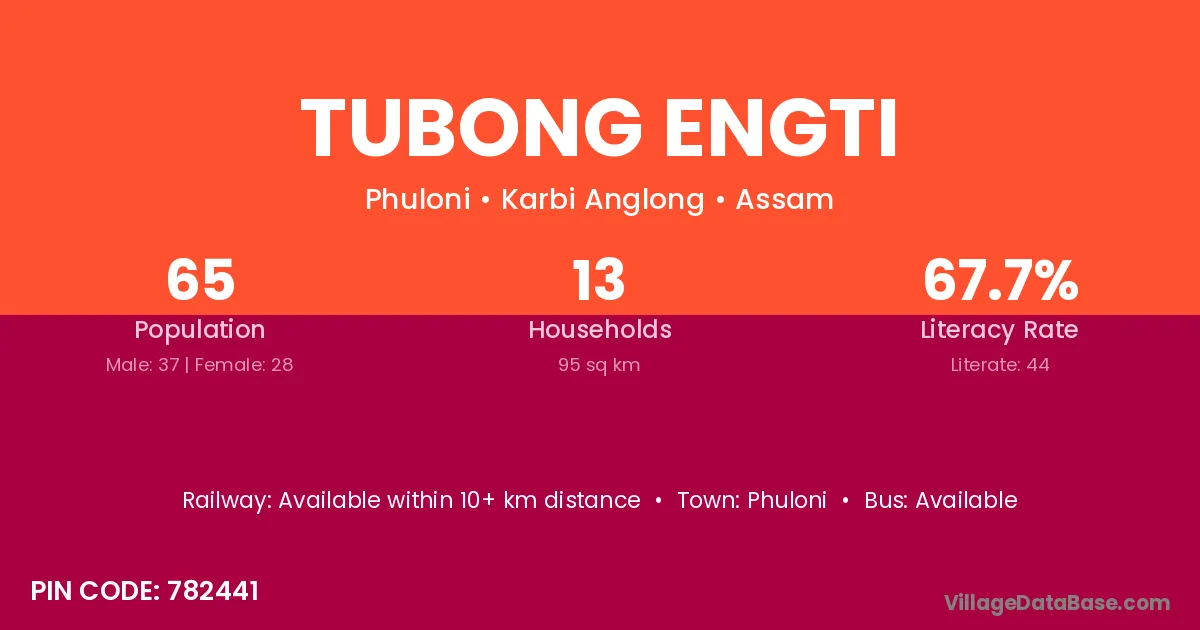 Tubong Engti village has a total population of 65 people, of which 37 are males and 28 are females.