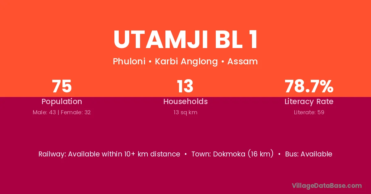 Dokmoka (16 km) is the nearest town to Utamji Bl 1 village for major economic activities and is located approximately 16 km away.