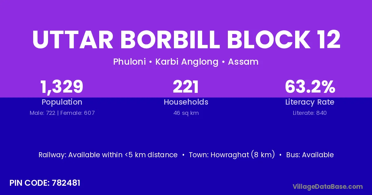 Howraghat (8 km) is the nearest town to Uttar Borbill Block 12 village for major economic activities and is located approximately 8 km away.